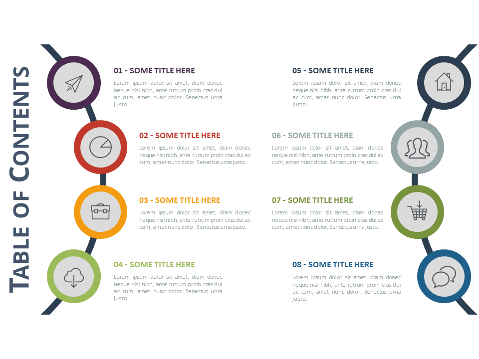 Free collection of table of contents and agenda templates for PowerPoint and Keynote. Ready-to-use editable templates for your presentations. 41 must-have slides for your presentations.