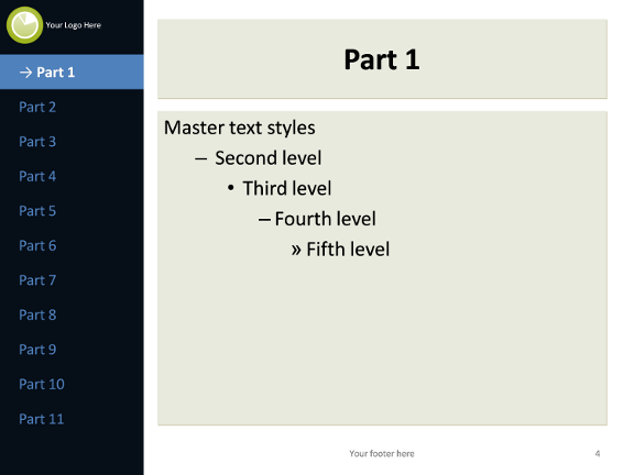 Modèle gratuit professionnel pour PowerPoint. Modèle simple aux couleurs bleue marine et blanc. Pack comprenant 10 slides: Page de garde, Sommaire, Slide basique avec titre et contenu, Avec menu intégré dans le bandeau à gauche (différents exemples), « A propos de nous », « L’équipe » et « Remerciements ».