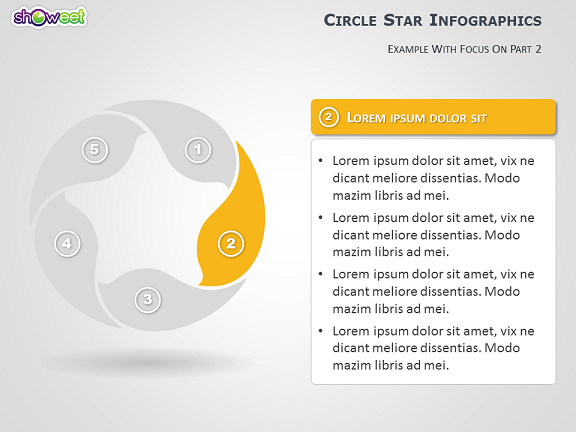 Diagramme PowerPoint gratuit en cercle avec 5 niveaux. Idéal pour présentations professionnelles ou stratégiques. Les 5 parties (semblables à des pétales) forment une étoile aux coins arrondis. Formes 100% éditables. Contient 10 slides.
